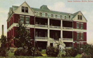 Imagine restoring "diseased and deranged organs" with treatments of "diet, exercise, electric light baths, salt glows, hot applications and packs, hot and cold sprays and galvanic and sinusoidal electricity." This was the claim of the privately owned Kansas Sanitarium, according to information found in the Wichita Beacon of 1919. The sanitarium was located on the western outskirts of Wichita, at 3201 W. Douglas. Its grounds stretched south to Maple and included a grove of fruit trees. During the half-century of its existence, the area went through four ownerships. The Kansas Sanitarium became the Wichita Sanitarium, then Rajah Rabbitry, and finally the Sedgwick County Hospital. The Kansas Sanitarium was founded in 1904 as a branch of the Battle Creek Sanitarium of Battle Creek, Michigan and was formally opened June 15, 1905. In 1908, a 1.5 acre artificial lake was constructed on the 40 acre grounds. Between 1915 and 1925, five buildings were added: a three story brick structure in 1915, a 36 room nurses’ home in 1919, another building and a sun parlor over the driveway leading to Douglas in 1921, and a mental annex in 1925 which raised the bed capacity of the facility to 60. In an advertisement in the Wichita Eagle, Oct. 31, 1926, with a photograph of the arched gateway to the grounds, the question was asked and answered, "Are you searching for health? Try a health service station, Kansas Sanitarium." Among the services were hydrotherapy, electrotherapy and physical therapy. They claimed that the nurses were "attentive and sympathetic" and the institution maintained a "homelike atmosphere." By 1927, the Kansas Sanitarium was in apparent financial difficulty and was sold to the Seventh Day Adventists who remodeled the building and renamed it the Wichita Sanitarium. It was formally opened in January 1928. The sanitarium placed an advertisement in the Wichita Eagle, New Year’s Day, 1929 stating their policy that "No person suffering from any mental or contagious diseases is now admitted. Acute and chronic medical cases are given special attention." Emphasis was placed on the fact that the institution was a sanitarium and not a hospital and had "become a delightful home for the invalid and those requiring rest and quiet." The Wichita Sanitarium existed just over two years and was purchased by the Rajah Rabbitry to house their "rabbit raising school." The rabbitry scheme convinced investors to buy shares in an enterprise to raise rabbits for food and supply fur for rabbit coats, promising huge profits. The short-lived venture failed after a few months when the instigator left town with all the funds, leaving starving rabbits behind. At the same time, the Sedgwick County Medical Society was pushing for a county hospital, and, in October 1930, the county purchased the sanitarium. To pay for the venture, the county commissioners sold the 240 acres of the old county poor farm, located at George Washington Boulevard and South Oliver. The new sanitarium was to be a combined hospital and poor farm. At first, the hospital was used mainly as a convalescent facility for patients who were treated in other Wichita hospitals. After remodeling was completed in February 1932, it became a full service facility. In May 1945, the 20 patients from the Sedgwick County tuberculosis hospital, located at the old county poor farm, were moved when the farm was finally sold. They were placed in quarters on the grounds south of the county hospital that had been used previously by the county welfare department. The tuberculosis hospital was closed in February 1952. As early as 1941, articles appeared in the local newspapers emphasizing the deficiencies of the county hospital. In 1950, plans were drawn for a new county hospital at East Ninth and Kansas Street It was formally opened June 27, 1953. On the same day, the last 33 patients of the old hospital were moved to the new Sedgwick County Hospital. The following summer, the old county hospital was razed and the grounds cleared for the West Douglas Park site. Today, all that remains to mark the site of the institution are a few remnants of sidewalk, a berm where the main sanitarium building once stood and a slightly raised path to Douglas indicating the location of the entrance drive. (Notes for the above article were gathered, in part, from the Tihen Notes, Special Collections, Wichita State University.)