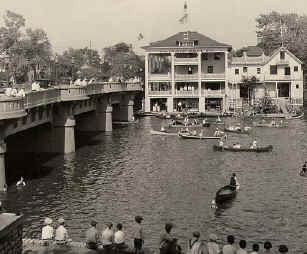 An especially popular event in the 1920-30s was a nighttime "fire dive" performed by daredevils from a tower above the building's roof. The diver ignited a gasoline soaked towel attached to his neck and hurled himself 75 feet to river below.