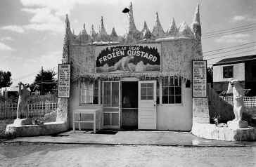 Wichita Once Had a Polar Bear Wichita once had not only polar bears, but also an iceberg. as well. They could be found on the southwest corner of Central and Oliver during the 1930-40s. At the Polar Bear Frozen Custard stand in 1938, one could buy a five-cent root beer, a sundae or malt for 15 cents, or something called a "polar whip" for a dime. Frozen custard was priced at ten cents per dish, 20 cents per pint or 40 cents for a quart. The small building sat diagonally facing the corner and with a little imagination, resembled an iceberg. The effect was created by thick white mortar and stucco formed to resemble ice and snow. Wichita during the era had several "folk architecture" structures including the Wishbone Building, also on East Central, and the Red Apple on North Broadway. Only the Wishbone still exists. It is owned by HPA and is available for a qualified recipent to restore. The site of the Polar Bear Frozen Custard Stand is now occupied by a Dollar General Store. 11/04/03 |