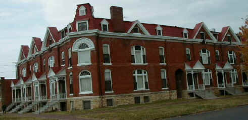 "This three-story brick Victorian apartment building is a relatively rare example of 19th-century multifamily housing in Kansas. Each of the multiple entry points on the main facade is marked by an exterior stair leading to a covered porch. A similarly